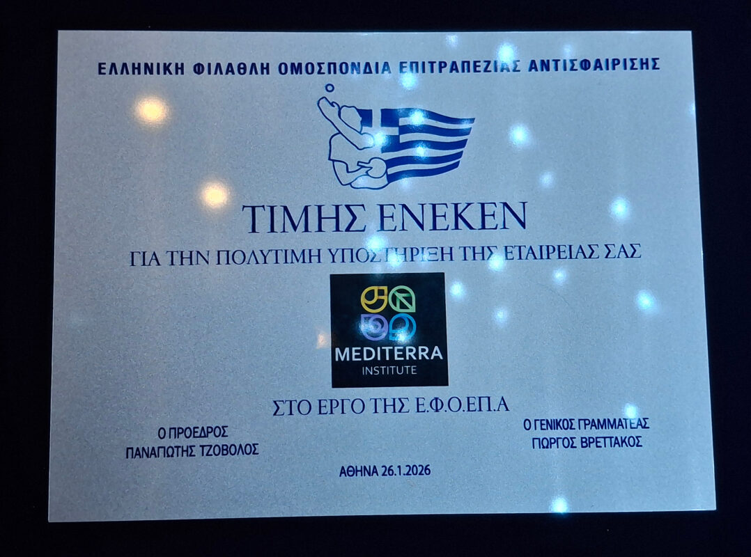 Η Mediterra Institute βραβεύθηκε από την Ελληνική Φίλαθλη Ομοσπονδία Επιτραπέζιας Αντισφαίρισης